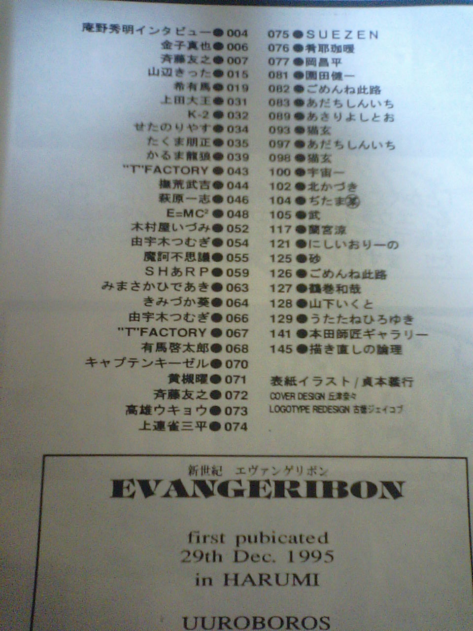 すごい面子! 総監督の庵野さんに監督の鶴巻さんに作監の本田さんにキャラデザの貞本さんにメカデザの山下さんに使徒デザインのあさりさんに…という、ほぼ半オフィシャルといっていい同人誌ですよ。しかも、放送終了後じゃなくて、まさに放送中に発行されてるし。今じゃ絶対にこんな本出せないだろうなぁ。すごいなぁ。