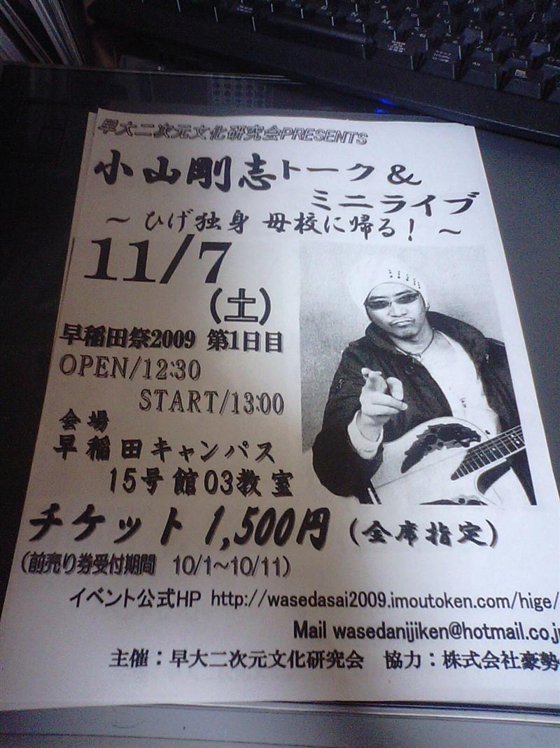 若くないなー。まぁでも、小山の兄貴の勃起力を少しでも分けてもらうべく奮って参加。のっけから黒板にちんことまんこのシンボルを描く兄貴は流石というか。ちなみに、男性声優のイベントにも関わらず、客層は男性7割という。その後、卑猥なトークとか、兄貴の半生記とかしつつ、サプライズで兄貴が浪川大輔さんに電話して、風呂上りで素っ裸の浪川さんがトークに電話で参加したり、一般参加の女性と兄貴のお見合い企画をこなしつつ、後半のミニライブへ。持ち歌2曲という兄貴のためにゲストとして、歌手のSuaraさんがサプライズ参加。Suaraの『トモシビ』を兄貴が唄う。そして最後の最後に来て、プライベートで来てた柚ちゃんこと柚木涼香さんと帽子野郎こと桐井大介さんが飛び入り参加。皆で『真・うたわれるもののテーマ』を合唱という感動的な大団円でした。楽しかったー。